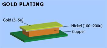 Trata-se de uma camada de ouro colocada sobre outra de níquel que, por sua vez, reveste o cobre, é extremamente durável e comumente utilizada em locais com elevado desgaste, e contato com meio externo, como keypads e conectores.