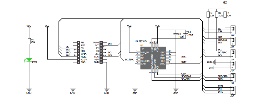 A click bord Accel 3 click vem com um acelerômetro de 3 eixos de alta performance e baixo consumo, o H3LIS331DL da ST. A placa, que funciona em 3,3V, pode comunicar com o microcontrolador através de SPI ou I2C, dependendo da configuração dos jumpers presentes na placa (os jumpers são com resistores SMD de 0 Ohm; São necessárias ferramentas de solda para trocar a configuração). Por default a placa vem configurada para I2C no endereço 0.