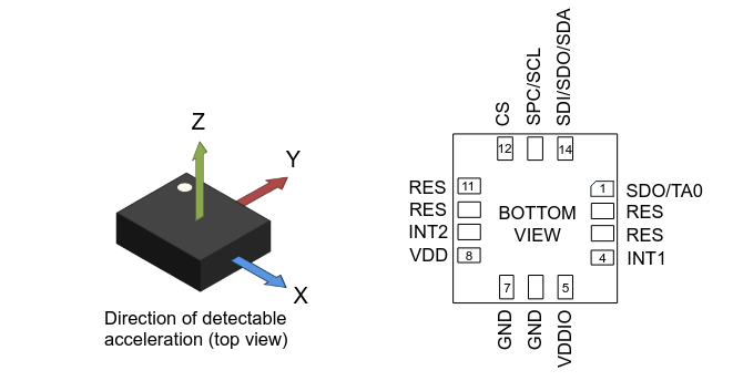 - Faixas de medição configuráveis de ±2 g, ±4 g, ±8 g e ±16 g