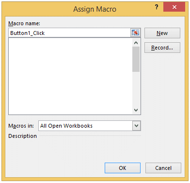 Assim que o botão for criado, aparecerá a janela mostrada na figura abaixo (caso a mesma não apareça, o leitor pode clicar com o botão direito do mouse sobre o mesmo e selecionar a opção Atribuir Macro (Assign Macro)), onde será possível inserir um determinado código, responsável pela realização da funcionalidade para a qual o botão foi designado. Neste ponto, deve-se escolher um nome para a Macro e clicar em Novo (New).