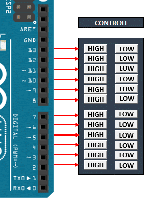 Muito legal seu artigo, funcionou perfeitamente e me ajudou bastante. Se possível gostaria de saber como adicionar o código das saídas dos demais pinos (3, 4 ,5, 6, 7, 8, 9, 10, 11, 12 e 13).