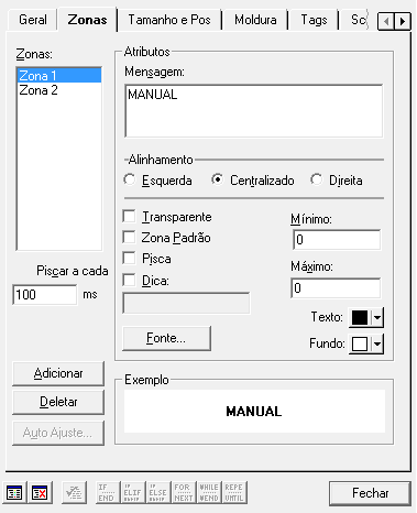 Os parâmetros mais interessantes neste momento estão na aba Zonas, onde serão criadas 2 zonas (botão adicionar) e cada uma apresentará uma mensagem caso estejam ativas. Portanto, para zona 1, a mensagem deve ser Manual e nos campos Máximo e Mínimo devem ser preenchidos ambos com zero, enquanto a zona 2 terá como mensagem a palavra Automático e os campos Máximo e Mínimo devem ser preenchidos com um (não se esqueça de associar a tag relativa ao Registrador Holding responsável por armazenar o estado da chave).