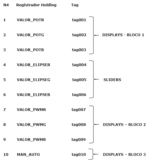 - O segundo bloco contém os registradores utilizados para armazenar os valores provenientes do Elipse SCADA, estes são chamados de VALOR_ELIPSER, VALOR_ELIPSEG, VALOR_ELIPSEB;