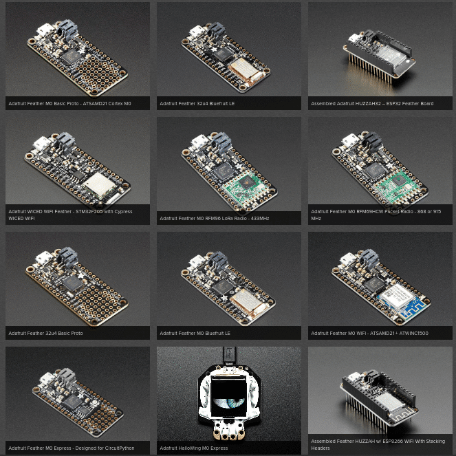 A Adafruit apostou tanto nesse no seu novo formato de placa que criou uma vasta gama de placas auxiliares (shields chamados de FeatherWings) que facilitam o desenvolvimento de aplicações. Além disso, um grande ecossistema de placas baseadas em outros microcontroladores foi criado, provendo ainda mais alternativas para a comunidade.