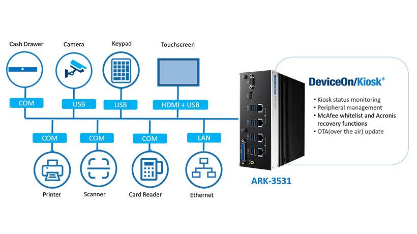 Além disso, os administradores podem usar o software Advantech DeviceOn/Kiosk+ integrado para monitorar, controlar e gerenciar remotamente quiosques de venda de bilhetes localizados em diferentes estações. De fato, eles podem pesquisar o total de bilhetes vendidos e o fluxo de caixa, realizar depuração e manutenção e atualizar o firmware e o software. O Advantech DeviceOn/Kiosk+ integra as funções McAfee Whitelist e Acronis recovery que melhoram a segurança dos dados.