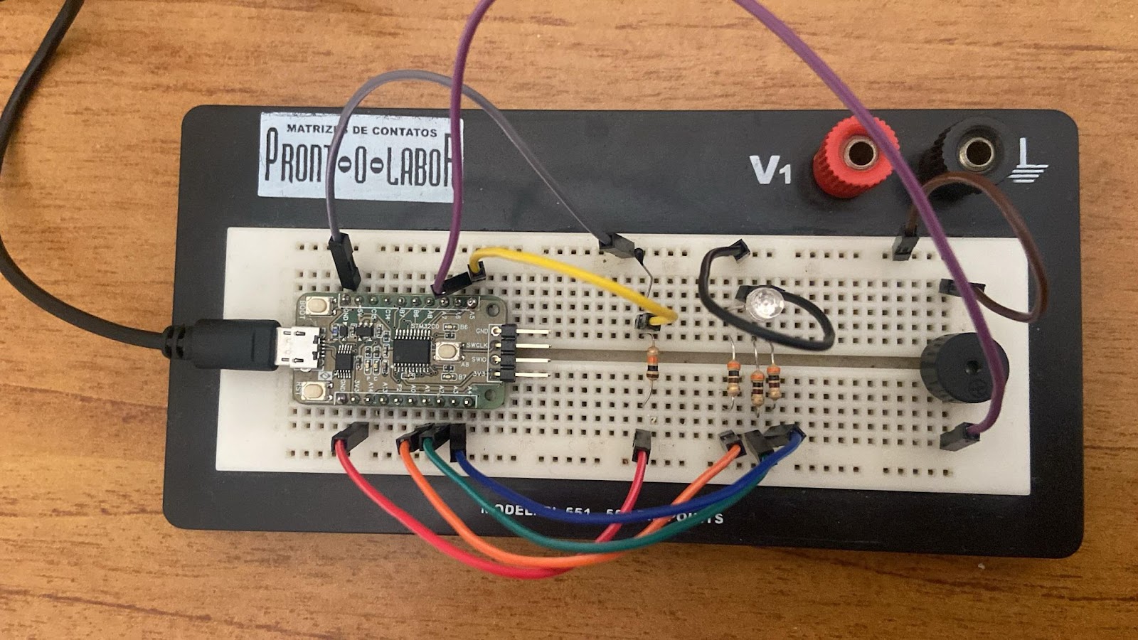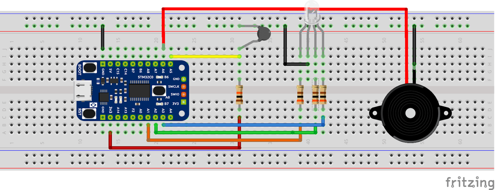 Montamos o circuito, configuramos o CubeMx, e escrevemos o código necessário para leitura do sensor e para que o LED mude de cor e o Buzzer toque dependendo da temperatura medida.