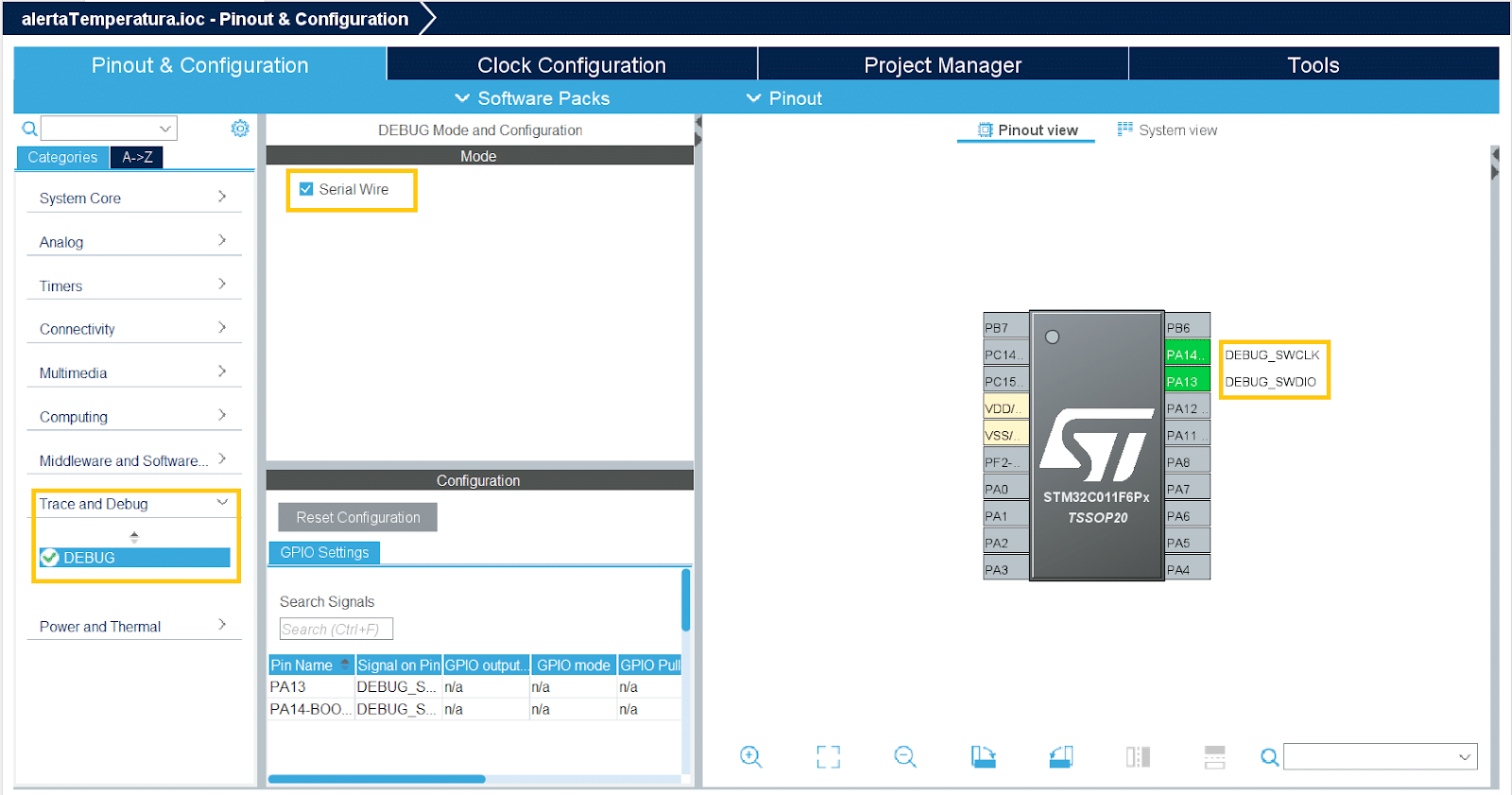 - Volte para a página de configuração dos pinos, selecione “Trace and Debug” e habilite “Serial Wire.