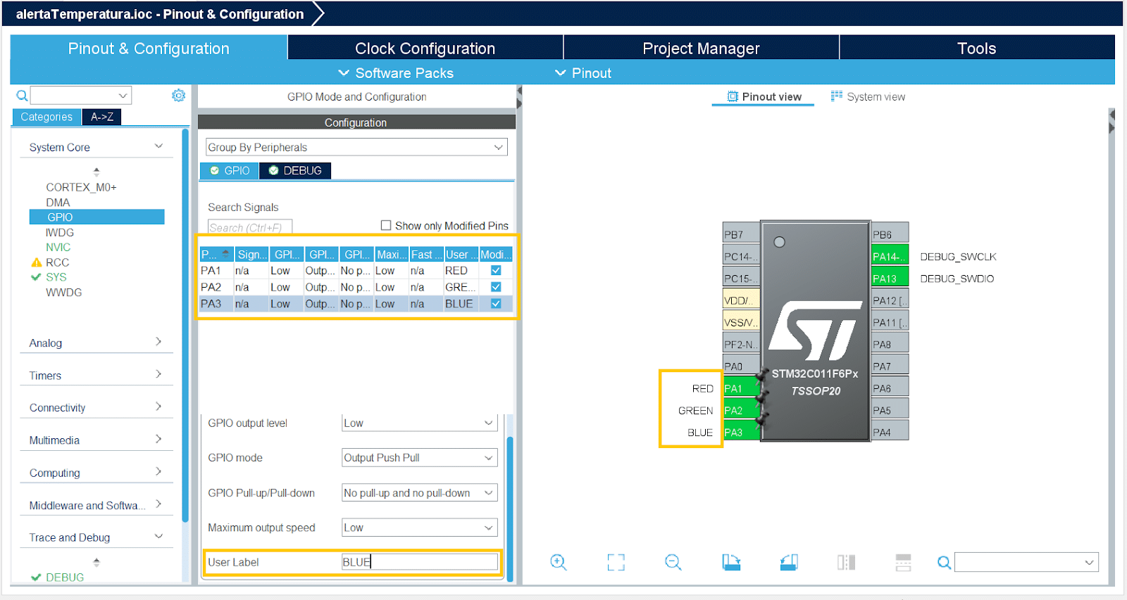 - Clique sobre os pinos PA1, PA2 e PA3 e selecione para cada um “Gpio_Outuput”.