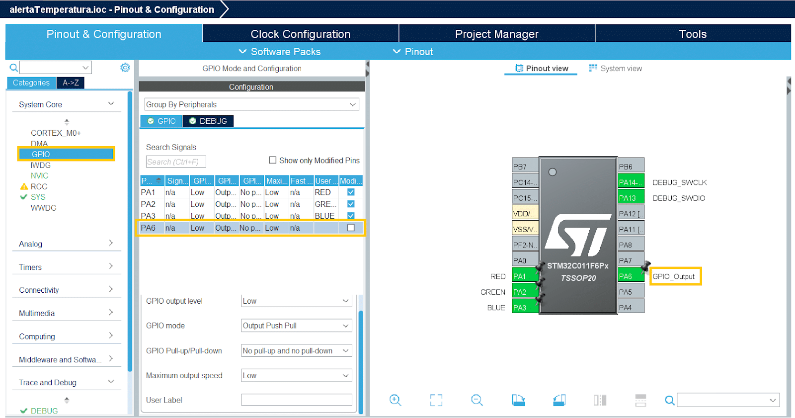 - Clique sobre o pino PA6 e selecione “Gpio_Outuput”. Depois, o renomeie como “BUZZER”.