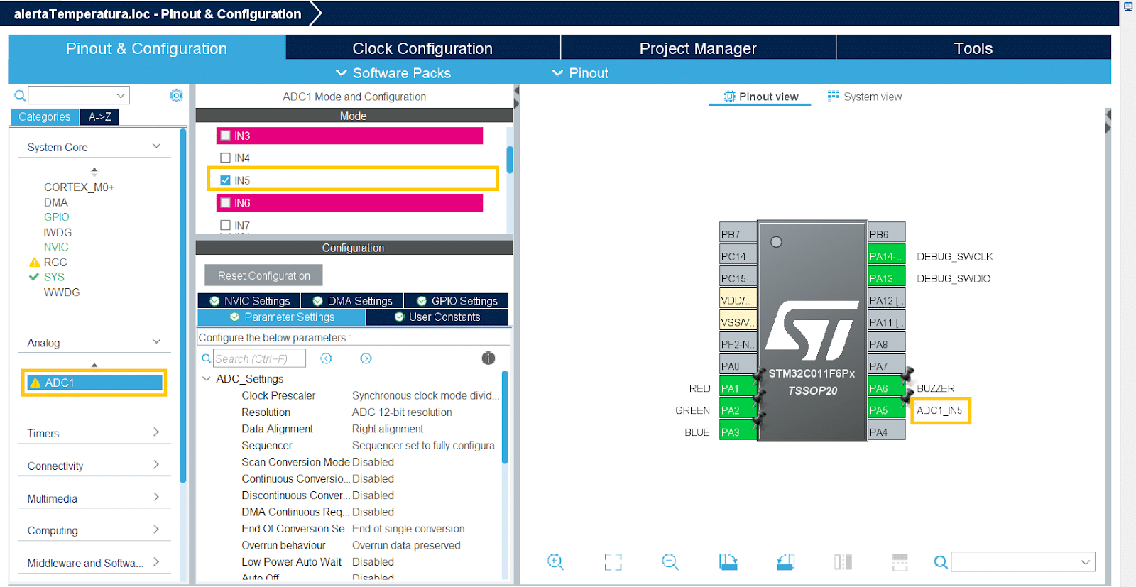 - Clique sobre o pino PA5 e selecione “ADC1_IN5”. Depois, em Analog > ADC1 habilite “IN5” e mantenha as demais configurações de Parameter Settings.