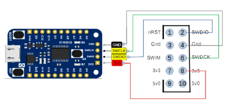 Ao finalizar o código, partiremos para gravação. Nessa etapa você pode utilizar o ST-Link seguindo as conexões da imagem abaixo e clicando em “run” no STM32CubeIde.