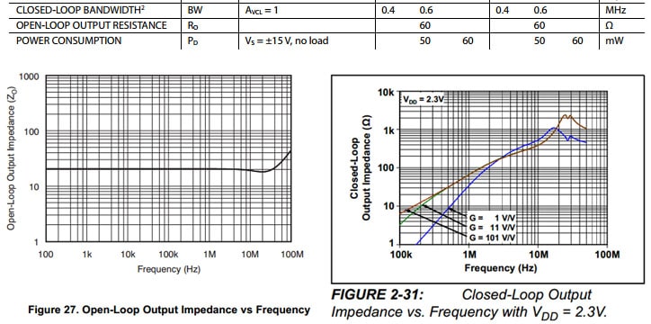 Quando disponibilizada, a forma de apresentação pode variar desde um valor constante em uma tabela até um gráfico. No caso dos gráficos, estes podem apresentar uma impedância quase que constante em toda a faixa ou bastante variável de acordo com a frequência. Em alguns casos, já apresentando o valor em malha fechada de acordo com o ganho do amplificador, como mostrado na figura a seguir (OP177 – Analog Devices, OPA827 – Texas Instruments, MCP6V26 – Microchip).