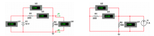 Primeiramente realizamos a análise para a fonte de tensão e depois para a fonte de corrente (a ordem inversa também funcionaria normalmente). Para facilitar o entendimento foram inseridos alguns instrumentos nos respectivos trechos do circuito onde estão visíveis os valores medidos, conforme a Figura 3.