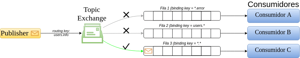 Consumidores destas mensagens podem monitorar determinado routing key (ou binding key, uma vez que estão associadas a uma fila) e executar ações específicas. Por exemplo, o consumidor A, que é responsável pela saúde de todo o sistema, está interessado em monitorar todas as mensagens de log de erros, independente do módulo que gerou a mensagem. Outro consumidor (B, por exemplo) está interessado somente nas mensagens do módulo de gerenciamento de usuários (users) independente do nível (info/warning/error). Para tal roteamento das mensagens, o exchange do tipo Topic permite a utilização de caracteres especiais no binding key das filas associadas ao exchange. Por fim, o consumidor C está interessado em todas as mensagens de log. Assim:
