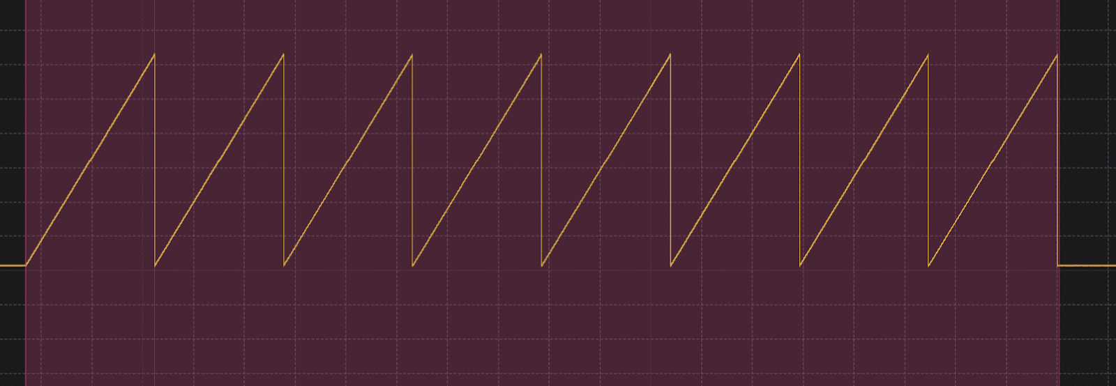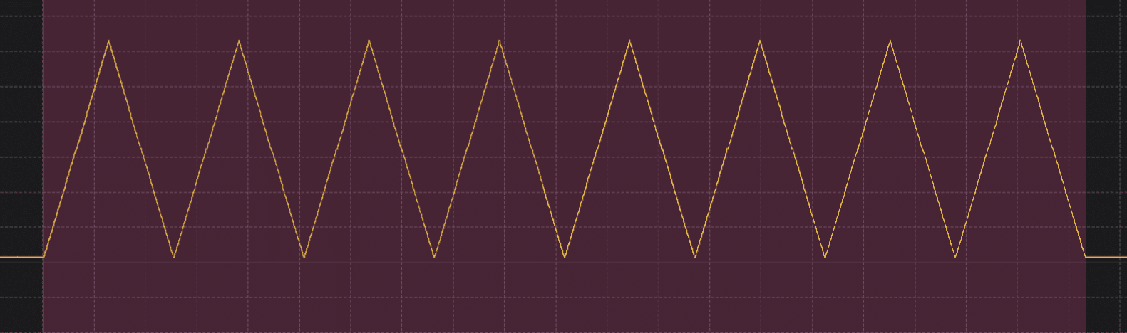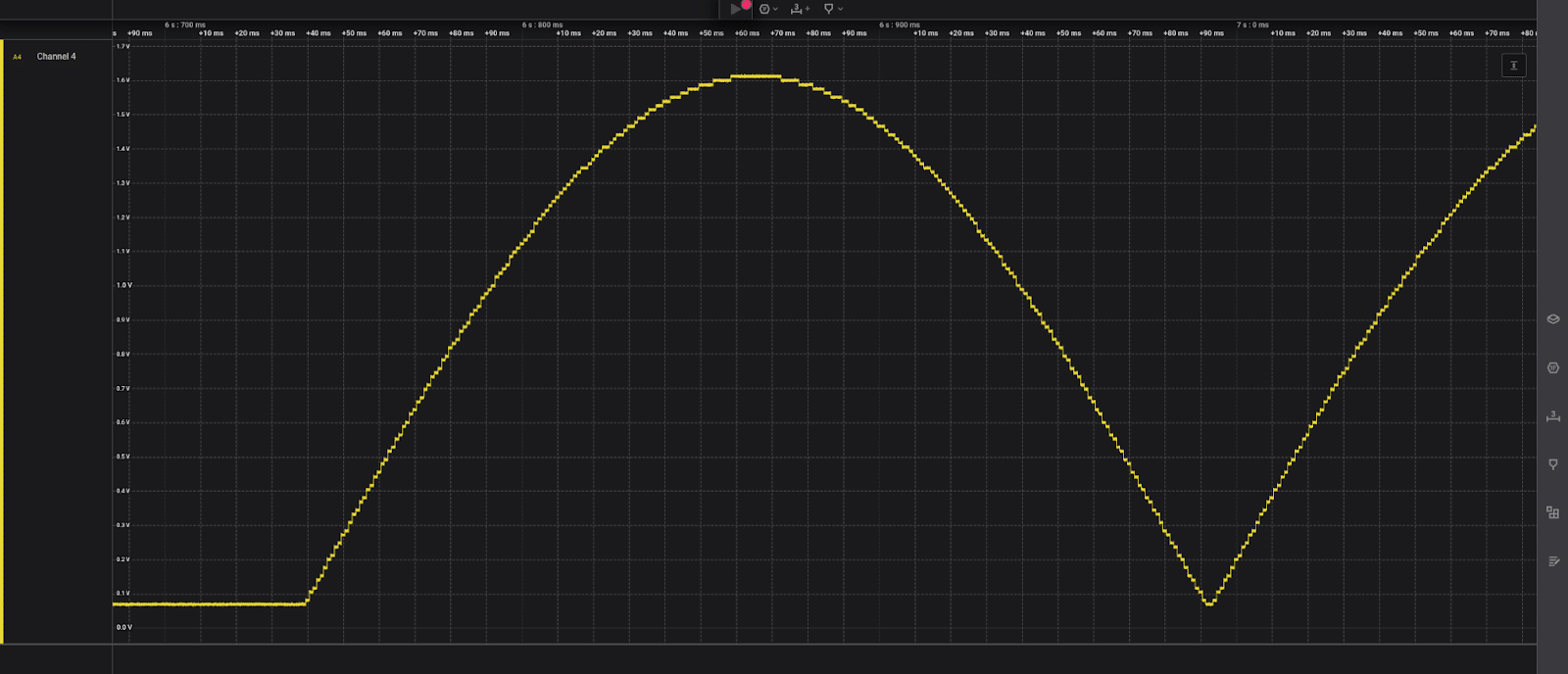 Como esperado de uma onda gerada via DAC, devemos ser capazes de ver os níveis e tempo de cada tensão gerada. Ou seja, veremos ondas levemente “quebradas” em minúsculas partes.