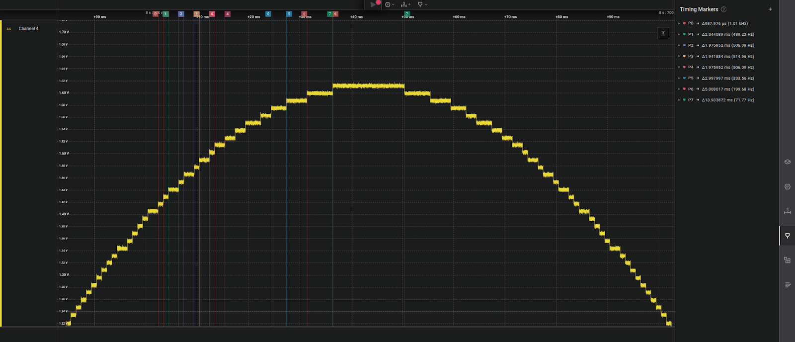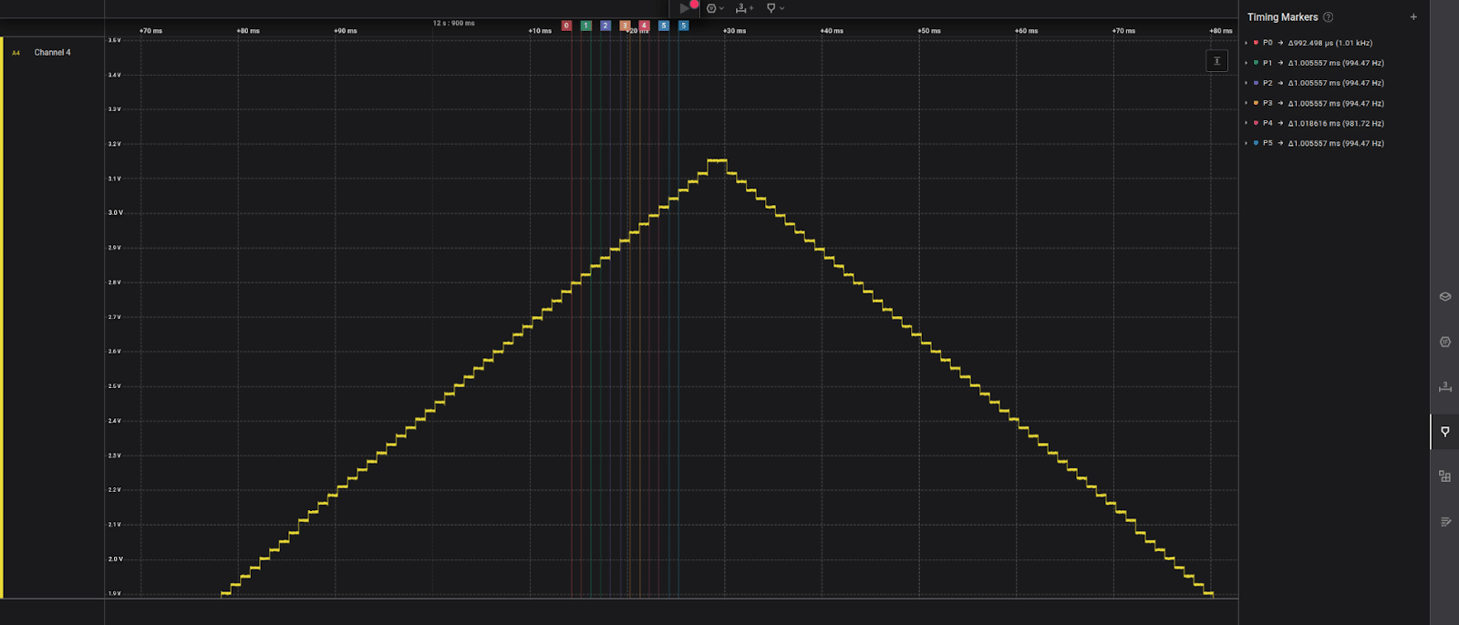 Ao analisar uma das ondas triangulares de perto, também podemos observar cada degrau do DAC e a duração de cada degrau. Adicionamos 6 marcadores temporais (tabela à direita da figura 8 acima) e podemos ver que todos degraus estão com duração de aproximadamente 1ms.
