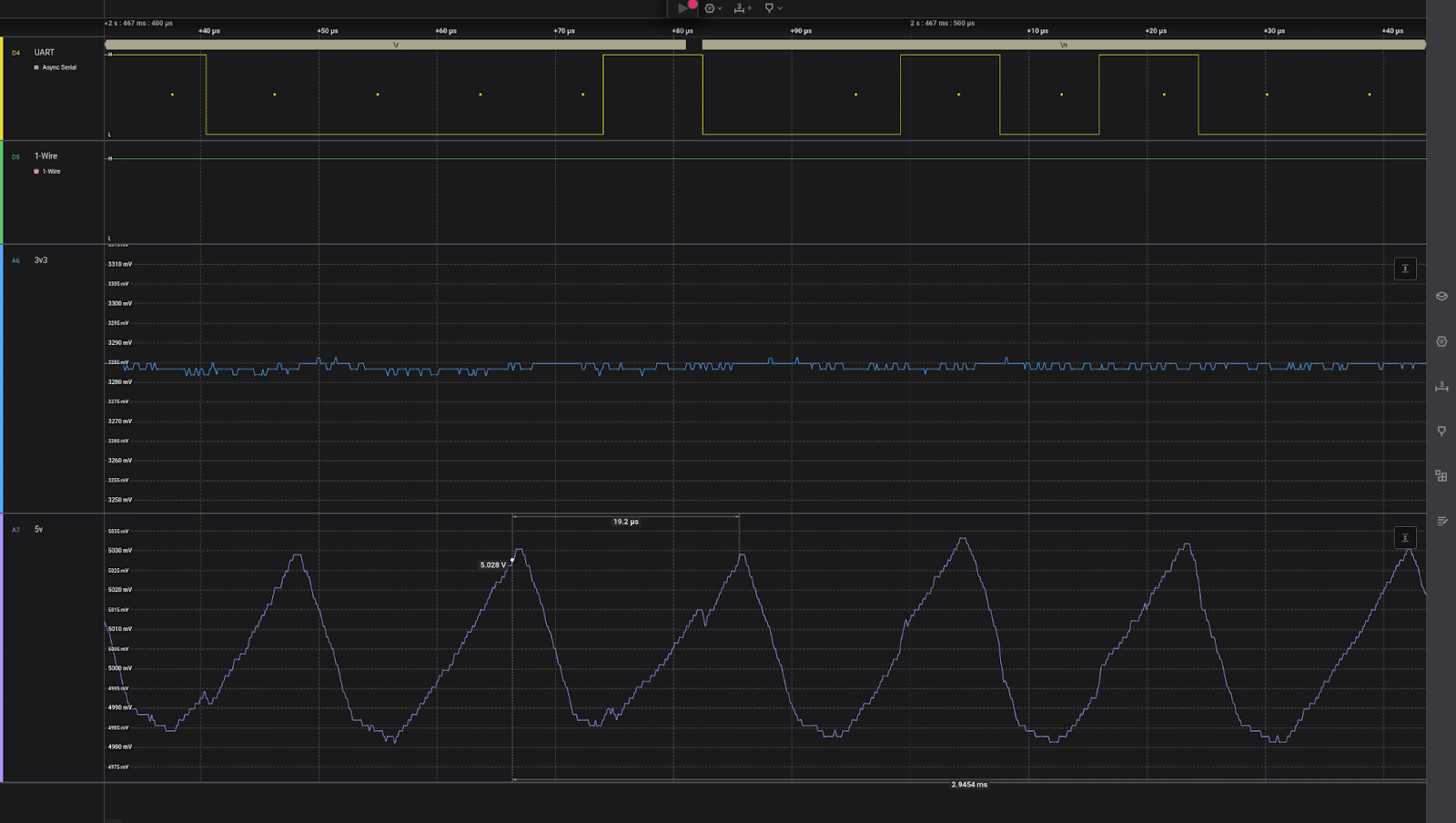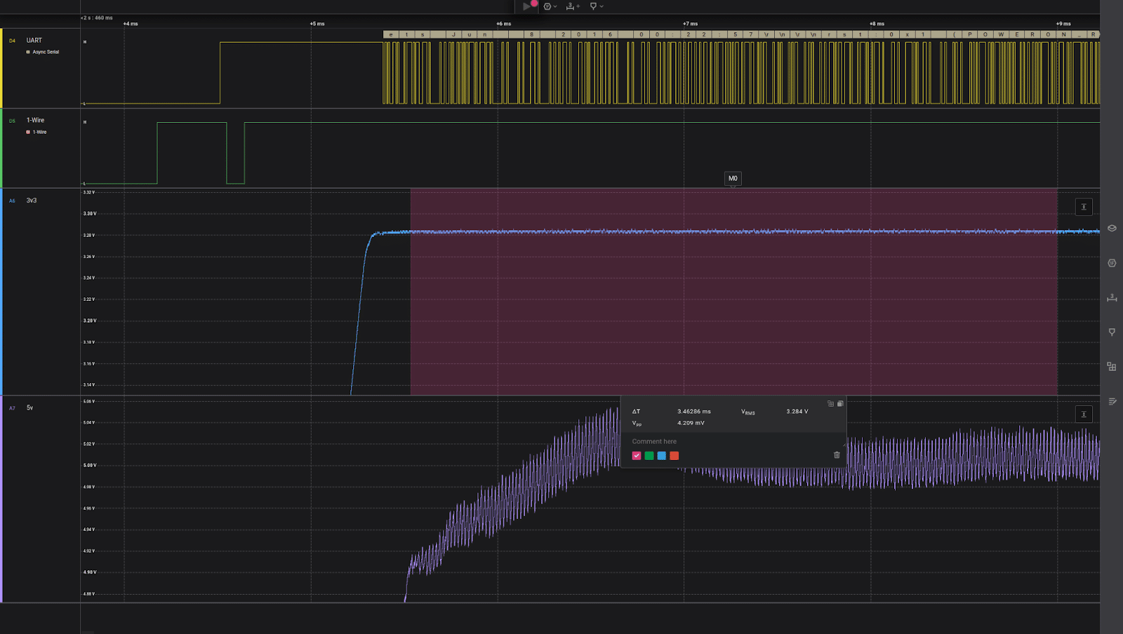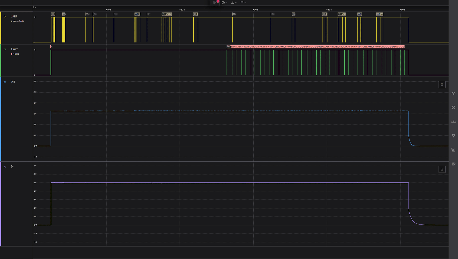 Com a análise acima, podemos concluir que as fontes estão bem dimensionadas para o circuito e inclusive não há grandes oscilações mesmo durante o pico de consumo do WiFi. O DS18B20 efetuou todas as conversões com sucesso e não causou nenhuma alteração na alimentação durante o funcionamento visto que seu consumo é baixo. Analisando o log serial (UART) do ESP32 também não houve prints indicando erros, lembrando que o canal de UART e 1-wire estão com os decodificadores de protocolos ativados, então os dados já estão prontos para visualizarmos de forma fácil.