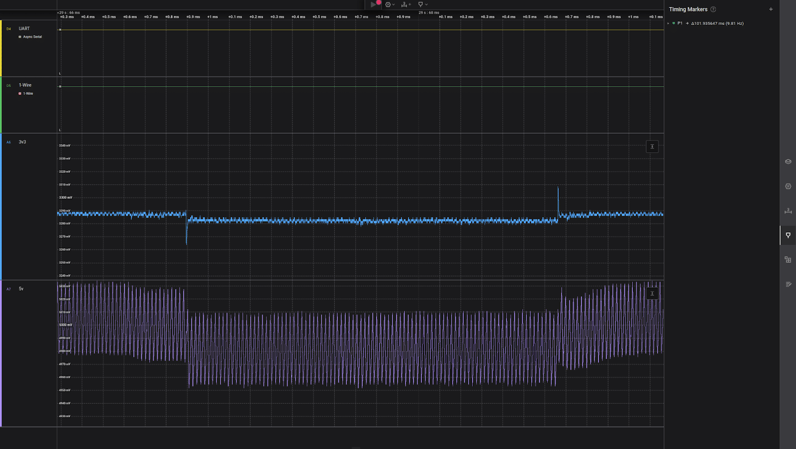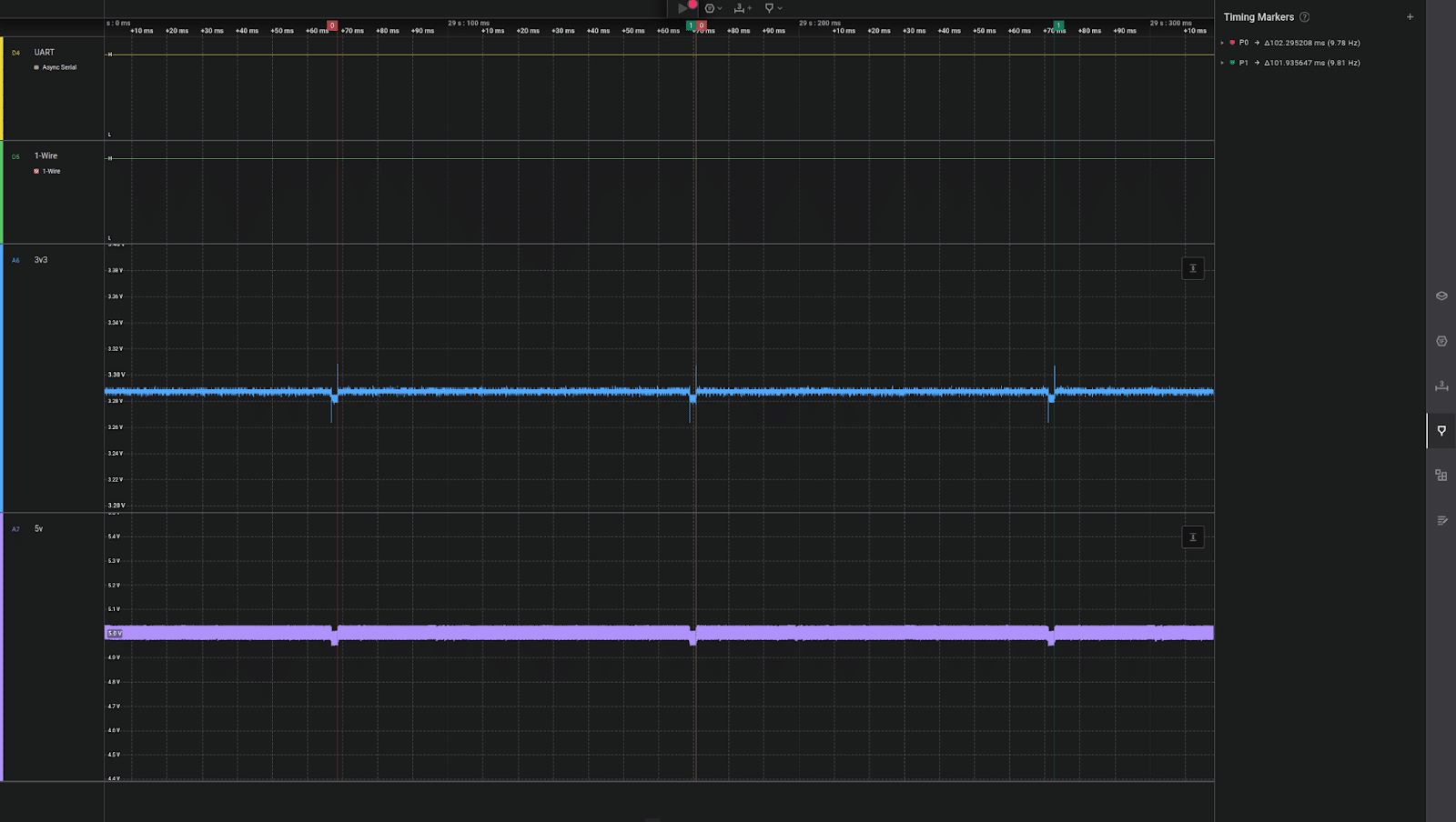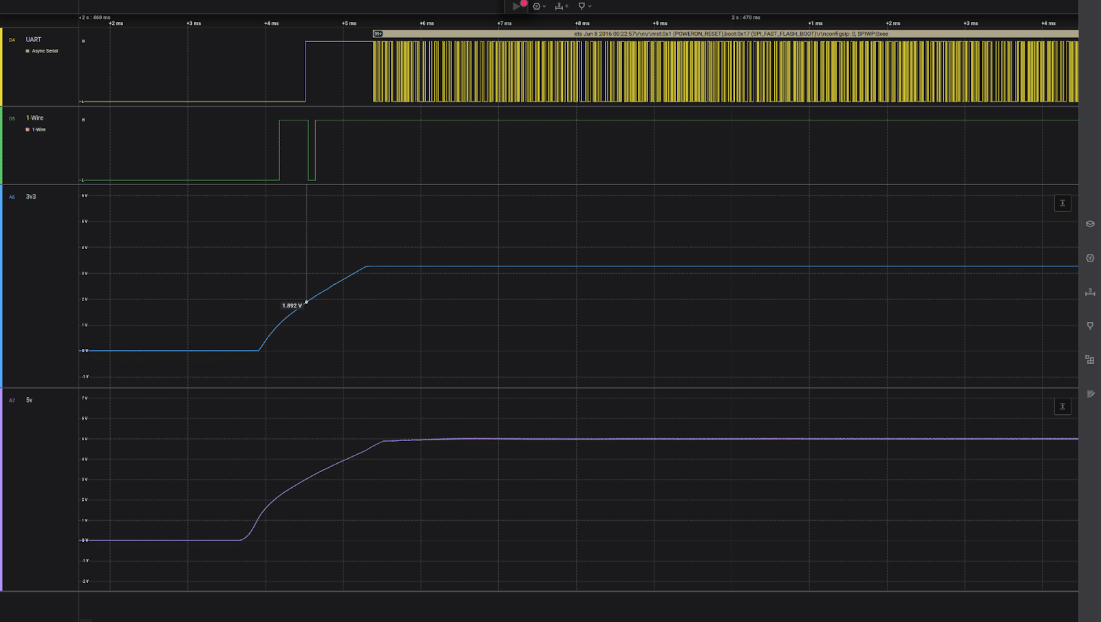 Com a análise acima, podemos concluir que as fontes estão bem dimensionadas para o circuito e inclusive não há grandes oscilações mesmo durante o pico de consumo do WiFi. O DS18B20 efetuou todas as conversões com sucesso e não causou nenhuma alteração na alimentação durante o funcionamento visto que seu consumo é baixo. Analisando o log serial (UART) do ESP32 também não houve prints indicando erros, lembrando que o canal de UART e 1-wire estão com os decodificadores de protocolos ativados, então os dados já estão prontos para visualizarmos de forma fácil.