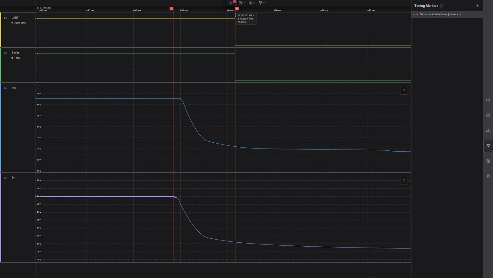 Para finalizar, podemos ver a queda de tensão após a remoção da fonte de alimentação do circuito, onde o microcontrolador demorou 13.25ms para que as GPIOs desligassem.