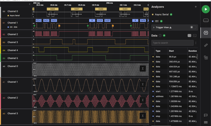 Alguns analisadores lógicos também contam com canais analógicos para auxiliar na medição de sinais que, por exemplo, seu microcontrolador está medindo e interpretando, facilitando muito o entendimento da situação completa, visto que você vai conseguir, ao mesmo tempo, analisar os canais digitais e também canais analógicos do seu microcontrolador. Este é o caso por exemplo dos analisadores lógicos da Saleae que serão utilizados ao longo desta série de artigos.
