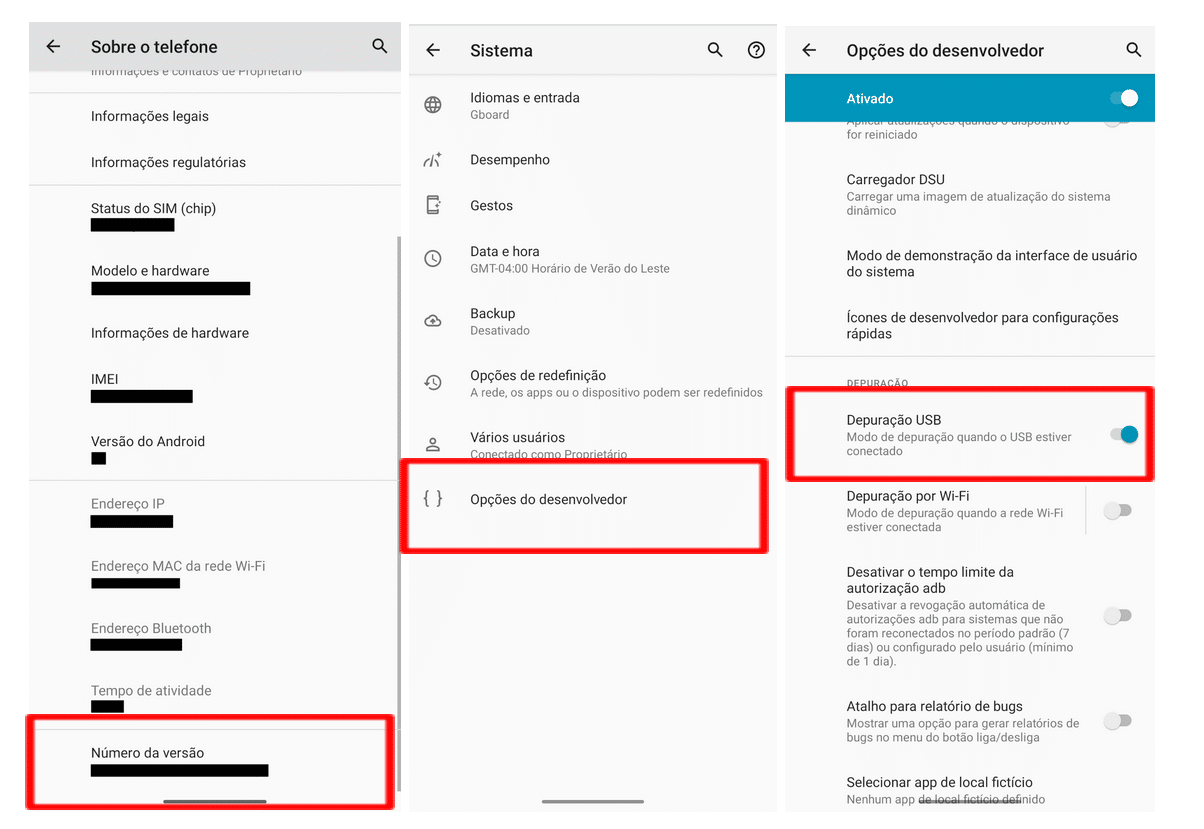 Para ativar o ADB, é necessário entrar na seção “Opções do Desenvolvedor”, como um Easter Egg no Android e fica escondida nas Configurações. Você deve seguir os passos abaixo, os quais são também demonstrados na Figura 1: