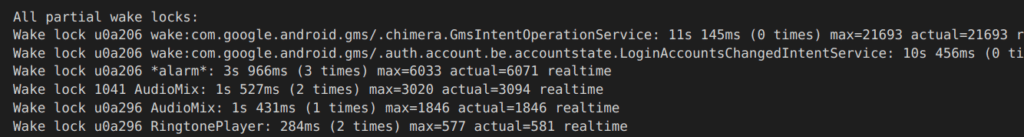 Para quem possui um emulador de Android ou um dispositivo que tenha privilégios de root, o comando $ adb shell cat /sys/kernel/debug/wakeup_sources mostra uma lista com todas as wake locks que estão sendo executadas no momento e informações importantes sobre elas.
