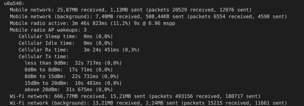 Pode-se encontrar informações tanto para módulos de rede móvel, quanto para Wifi e Bluetooth. Alguns exemplos são o tempo que o módulo esteve escaneando a rede, o tempo que ele esteve recebendo ou enviando dados na rede e a qualidade do sinal de recebimento de dados categorizados como: very poor, poor, moderate, good, great, variando a potência de acordo com o módulo que está sendo usado.