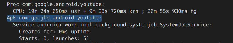 Esta seção organiza as wake locks que apareceram na seção anterior por PID e o tempo que elas permaneceram segurando a CPU acordada. Abaixo podemos ver um exemplo: