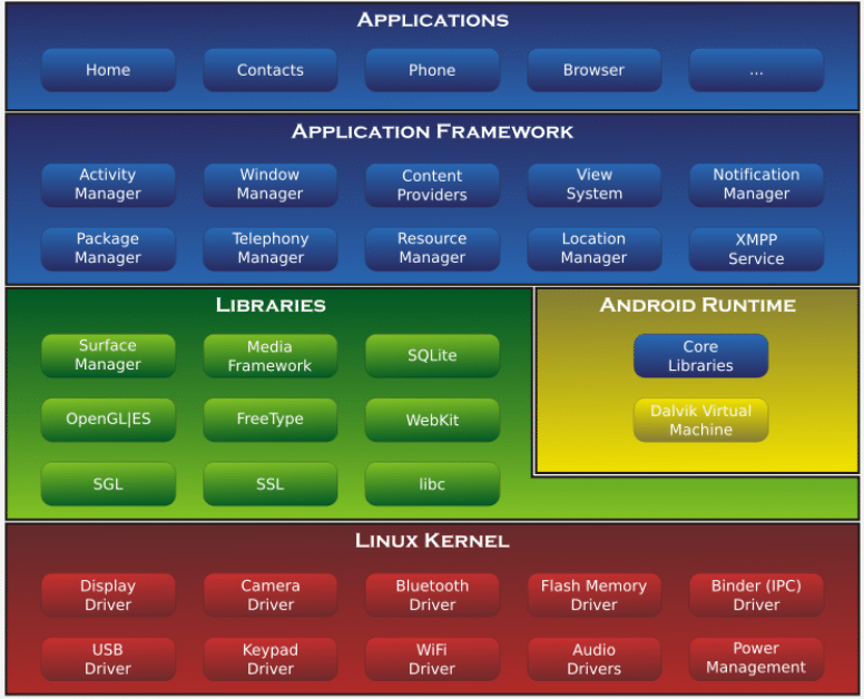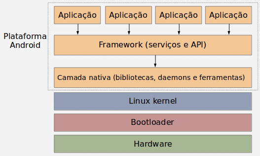 Em termos de arquitetura de software o Android pode ser representado pela figura 1. Nela, é possível observar que o que chamamos de Plataforma Android propriamente dita (ou seja, o que desenvolvedores alto-nível de aplicações que utilizam framework do Android) é a parte com maior nível de abstração (de biblitecas, daemons e tools para cima). O restante, apesar de ter suas peculiaridades, é fortemente baseado no Linux.