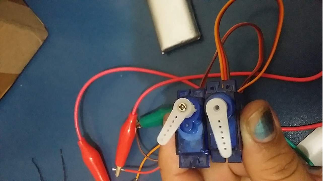 Quando fizemos os testes da primeira bateria com os servos, percebemos que o Arduino reiniciava e um dos servos não se movia. Percebemos que a bateria comum de celular, que geralmente utilizamos nos projetos, não deu conta de alimentar dois servos e um Arduino Pro mini.