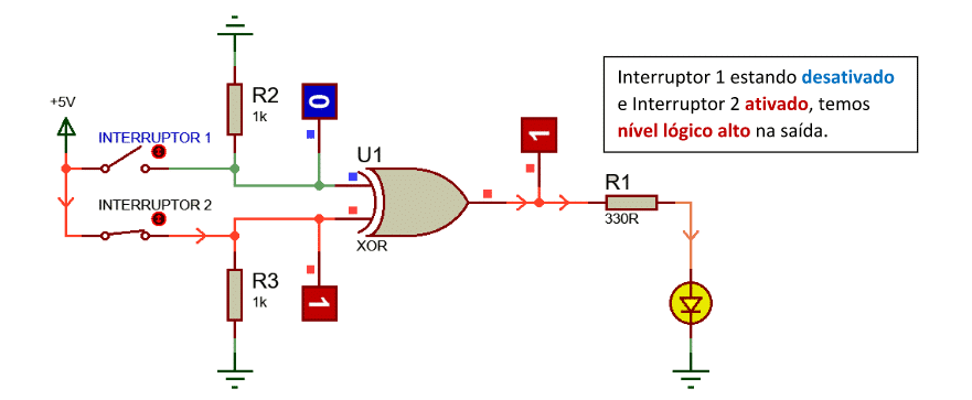 Após observar os circuitos funcionais da porta lógica XOR, podemos afirmar que a saída só é acionada quando apenas uma das entradas é ativada, ou seja, as entradas precisam ter sinais lógicos diferentes para a saída ser ativada.