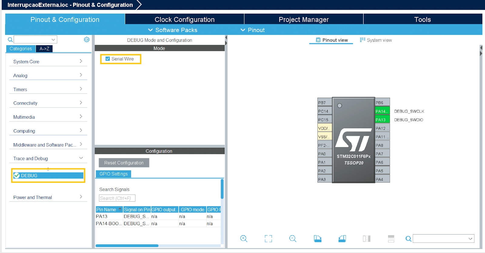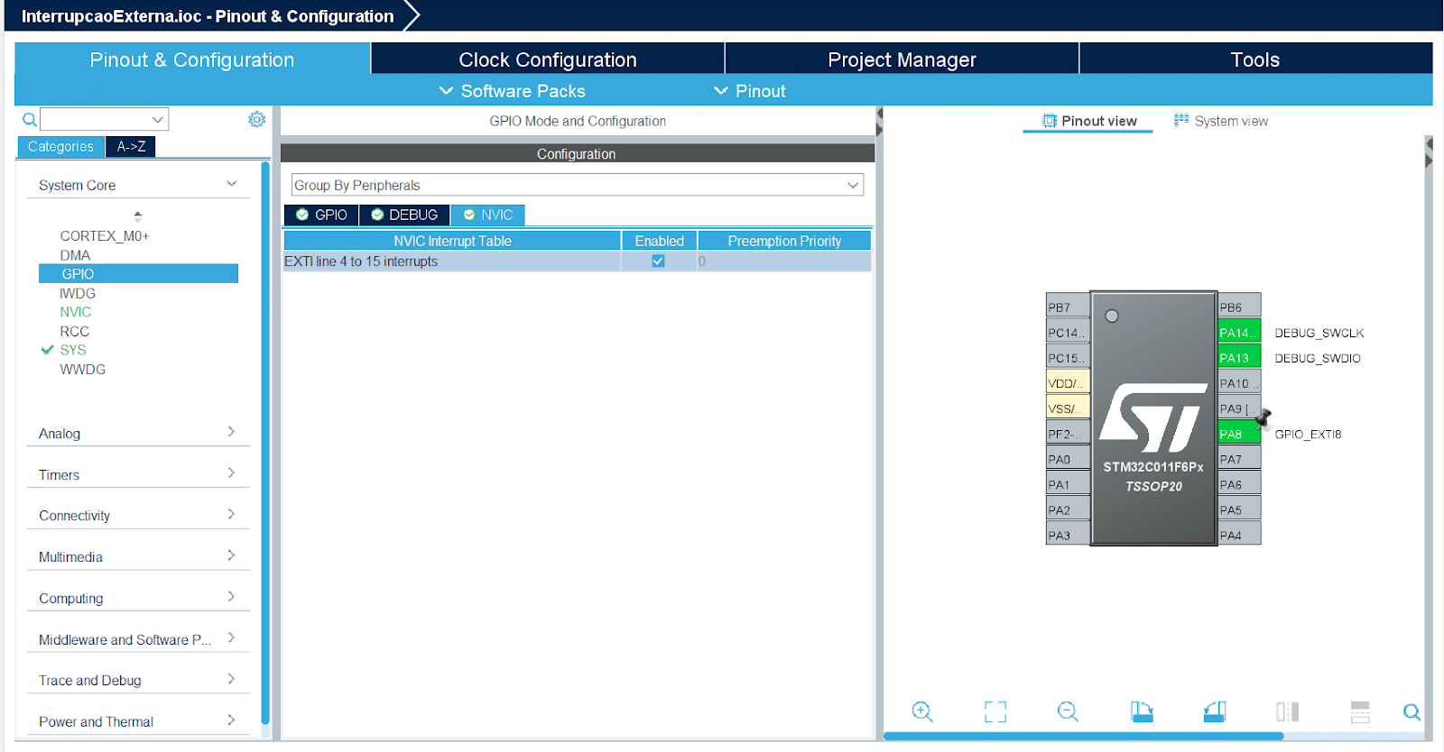 No núcleo do processador Cortex-M0+, o controlador de interrupção vetorial aninhado (NVIC) e o controlador de eventos externos (EXTI) desempenham papéis de gerenciamento dessas interrupções. O NVIC oferece suporte a níveis de prioridade, enquanto o EXTI é responsável por lidar com eventos externos, como a mudança de estado de pinos que exploraremos neste tutorial.