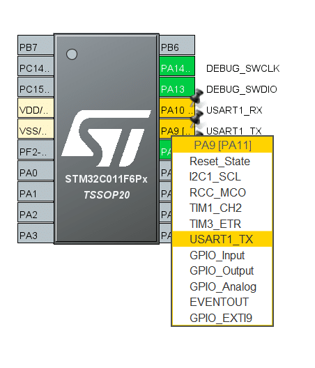- Depois, seleciona PA10 como “USART1_RX” e PA9 como “USART1_TX”.