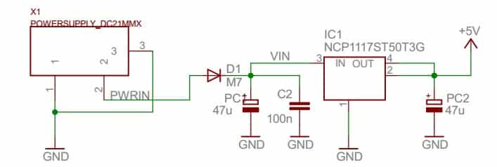 O circuito regulador para entrada externa é idêntico ao da Arduino Uno e é exibido a seguir. Nota-se que o CI responsável pela regulação de tensão é o OnSemi NCP1117: