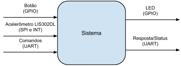 O que tem que ser desenvolvido é um firmware para o microcontrolador. Como vai ser utilizado um botão para indicar uma ação do usuário, deve ser utilizado um GPIO do microcontrolador para realizar essa interface, cujo acionamento é executado por um driver GPIO. Esse mesmo driver pode ser utilizado para acionamento do LED. Para o tratamento desses dois periféricos/drivers deve ser criado um serviço de abstração para cada. O mesmo pensamento se aplica para o aceletrômetro e a porta serial UART. No caso do acelerômetro devem ser desenvolvidos dois drivers, um para o periférico SPI e outro para o dispositivo LIS302DL, e um serviço. Para o periférico UART tem que ser desenvolvido um driver e, consequentemente, um serviço para tratar a stream de dados da porta UART.