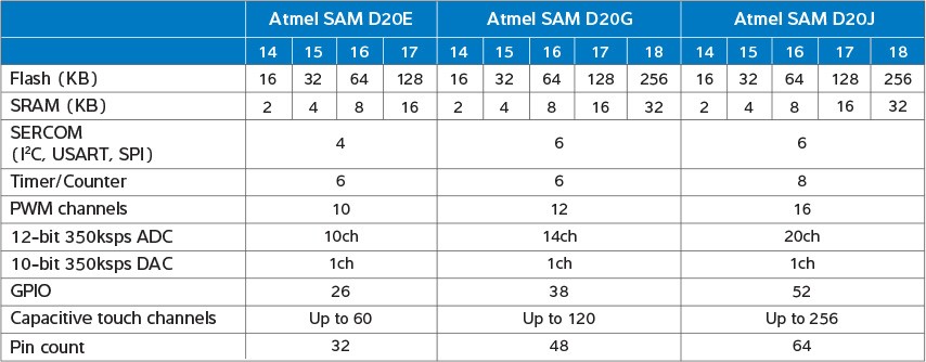 A família SAM D20 é dividida em 3 séries: SAM D20J, SAM D20G e SAM D20E. Algumas de suas diferenças estão listadas na Figura 1, abaixo.