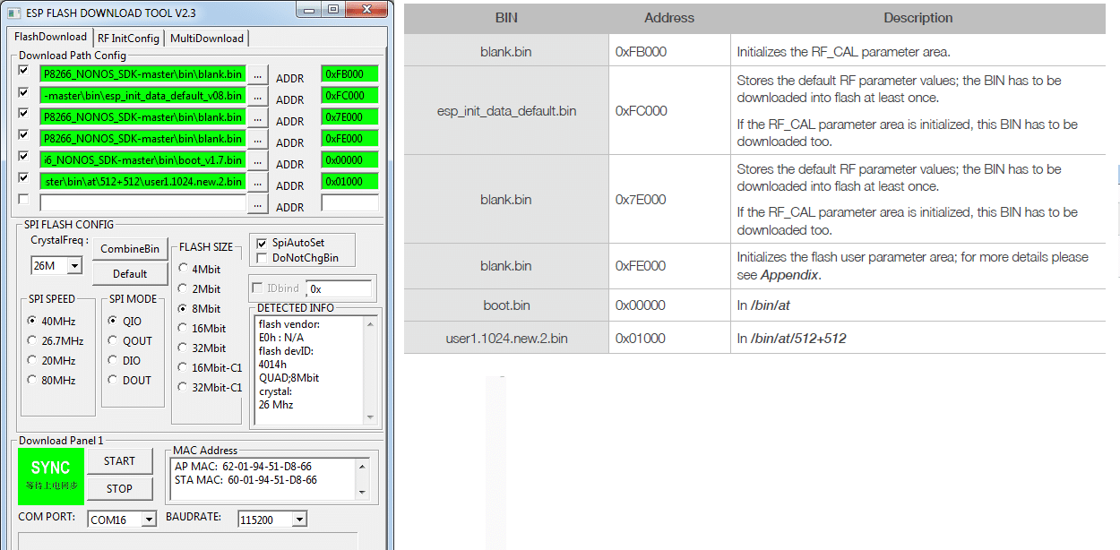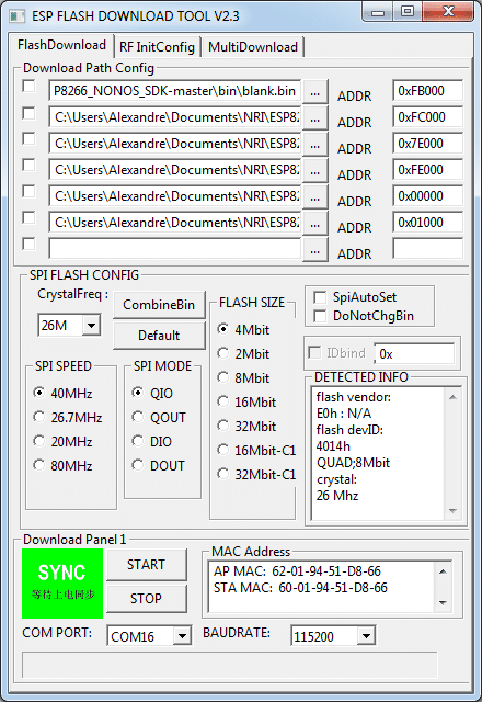 Seguindo os arquivos indicados pelo manual, em “Download Path Config” procure por todos os arquivos e preencha os endereços de memória corretos, habilite a opção “SpiAutoSet”, escolha o Flash Size correto, e clique em START para iniciar a gravação.