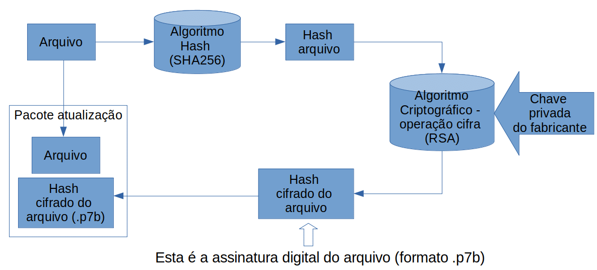 Então precisamos adicionar mecanismos de segurança de forma a garantir a integridade, autenticidade e não-repúdio do pacote de atualização. Para isso é recomendado o uso da assinatura digital. Com ela se garante que: