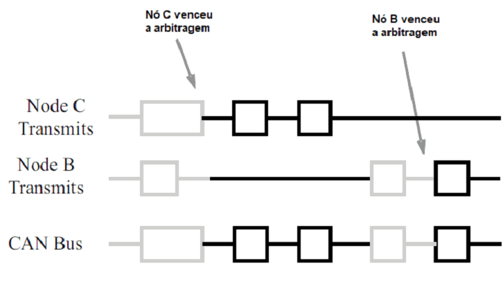 O processo de arbitragem CAN é tratado por um controlador da CAN. Como cada nó monitora continuamente suas próprias transmissões, então, na figura a seguir, como o bit recessivo do nó B é sobrescrito pelo bit dominante de maior prioridade do nó C, B detecta antecipadamente que o estado do barramento não corresponde ao bit a ser transmitido, portanto, o nó B interrompe a transmissão enquanto o nó C continua com sua mensagem. Depois você pode ver outra tentativa de transmitir a mensagem é feita pelo nó B quando o barramento é liberado pelo nó C. Essa funcionalidade faz parte da camada de sinal físico da ISO 11898, o que significa que ela está contida inteiramente dentro do controlador da CAN e é completamente transparente para um usuário da CAN.
