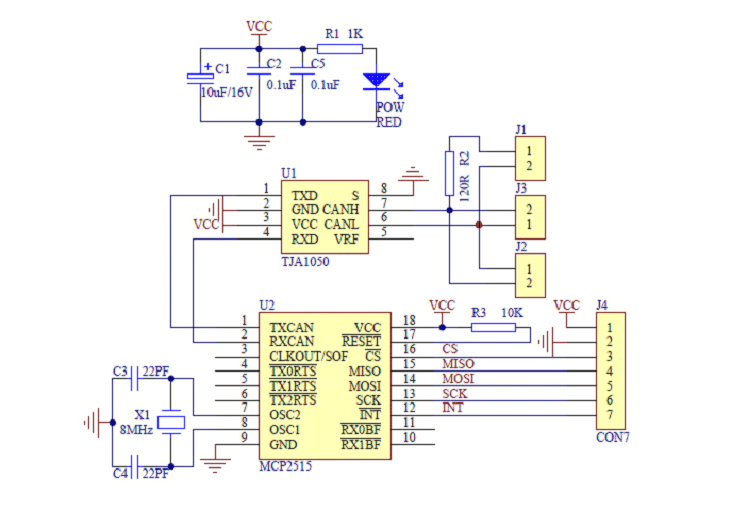 Também a saída do MCP2515 não é apropriada para um barramento CAN, portanto, um Transceiver é integrado ao projeto, nesse caso TJA1050. Veja os detalhes nas figuras a seguir. O jumper para o resistor de terminação (120 Ohms) foi fechado em ambas placas.