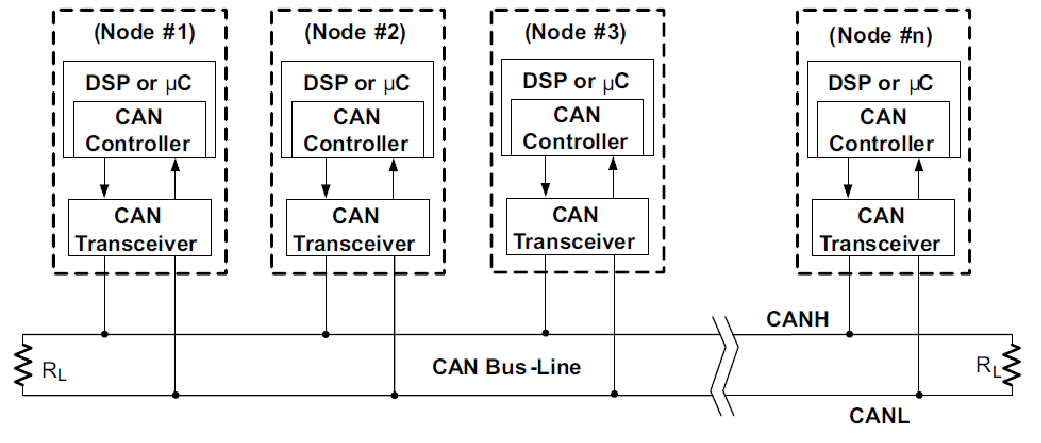 Outro conceito bastante interessante é o NRZ (Non Return to Zero), onde cada bit (0 ou 1) é transmitido por um valor de tensão específico e constante. Na CAN todos os nós são conectados em pontos comuns (CANH e CANL). Segundo os padrões a CAN alta velocidade, comunica numa taxa de 512 Kbps (ISO 11898-2), e a CAN baixa velocidade, comunica numa taxa de 125 Kbps (ISO 11898-3).