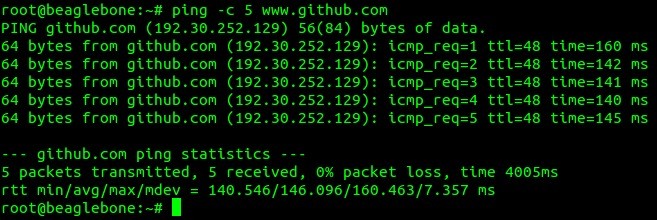 3 – Para testar basta usar o comando ping com alguma URL confiável e ver se os pacotes requisitados chegarão na Beaglebone Black.