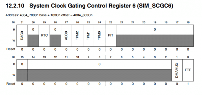 As figuras abaixo ilustram os itens pertencentes ao registrador System Clock Gating Control Register 6 (SIM_SCGC6).
