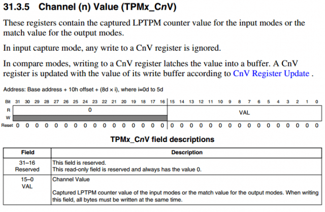 A determinação do valor da Duty Cycle é através do registrador Channel (n) Value (TPMx_CnV). Para escrever neste registrador deve ser utilizada a macro TPM_CnV_REG(base,index), onde base é TPM (TPM0, TPM1 ou TPM2) e index é o número do canal. Na figura abaixo são apresentados os detalhes do registrador Channel (n) Value (TPMx_CnV).