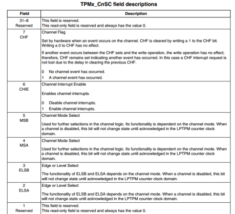 Para configurar o canal como saída do sinal do Timer/PWM Module, é através do registrador Channel (n) Status and Control (TPMx_CnSC). Para selecionar o canal é utilizada a macro TPM_CnSC_REG(base,index), onde base é módulo TPM (TPM0, TPM1 ou TPM2), e a escolha do canal é através da variável index.