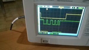 A seguir temos imagem de saída do circuito do divisor de tensão com o MCP41010. E podemos observar no osciloscópio sinal de saída do divisor tensão.