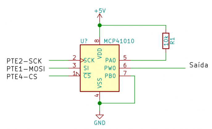Para demonstrar a utilização da biblioteca de software apresentada acima, criei um circuito divisor de tensão utilizando o potenciômetro digital MCP41010 da empresa Microchip Technology. A ferramenta utilizada para o desenvolvimento da aplicação foi o Kinetis Design Studio IDE.