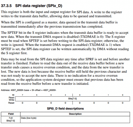 O registrador SPI data register (SPIx_D) é utilizado tanto para leitura quanto para escrita. Quando a comunicação está configurada no modo Mestre (Master), é utilizado para carregar o buffer de transmissão. Quando a comunicação estiver configurada Escravo (Slave), é através desse registrador que devemos ler o conteúdo do buffer.