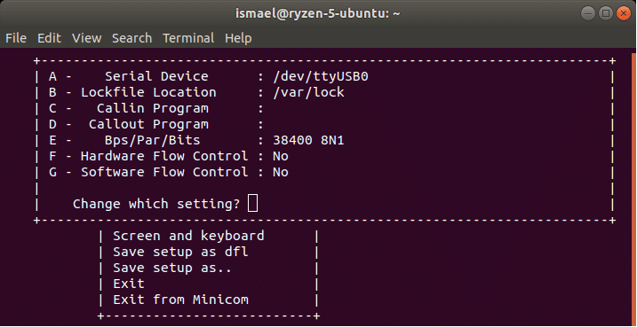 O nome do meu adaptador no Linux é “ttyUSB0”. Edite para que a configuração atual fique “Current: 38400 8N1”, conforme a figura 4.