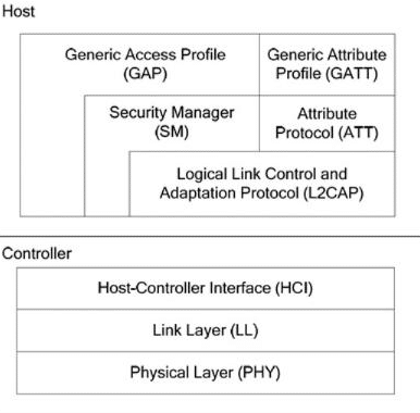 Antes de qualquer coisa, temos que dar aquela revisada nos componentes principais da pilha bluetooth low energy, que chamarei de BLE daqui pra frente. De modo geral ela é bem parecida com o já conhecido bluetooth classic, a sua distinção ocorre nas camadas superiores, principalmente em uma que não existe no bluetooth classic, o GATT. A camada do GATT é responsável por descrever os diversos serviços e as características existentes dentro destes funcionando como endpoint para troca de dados. Abaixo vamos ver a arquitetura simplificada da pilha BLE: